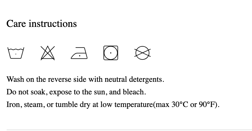 Care instructions Wash on the reverse side with neutral detergents. Do not soak, expose to the sun, and bleach. Iron, steam, or tumble dry at low temperature (max 30℃ or 90℉).